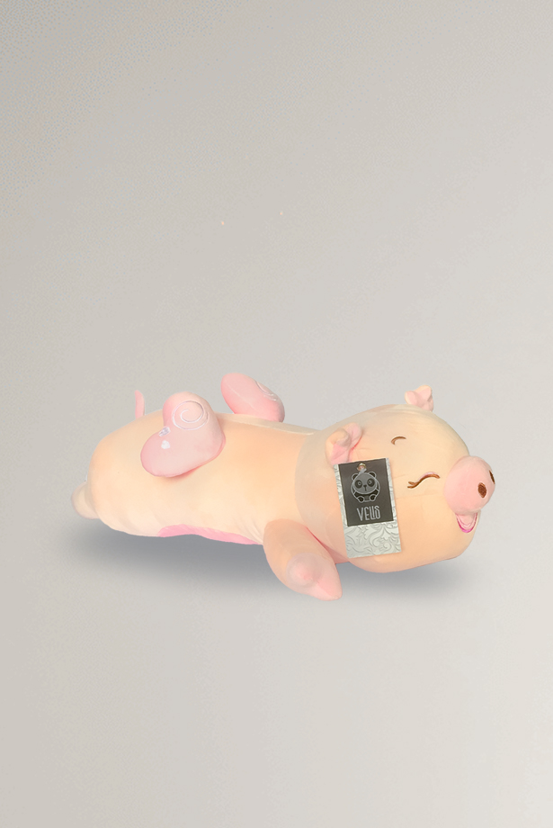 Soft, light pink/peach Fling Pig plush toy lying on its back, with small pink heart-themed wings, a happy closed-eye smile, and a product tag near its head.