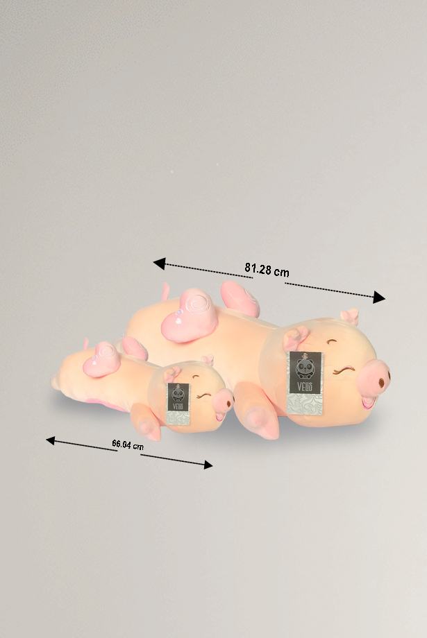 Close-up product photo of a Fling Pig Plush/Teddy Bear, showing its light pink fabric, embroidered smile, floppy ears, and small heart-patterned wings. The plush is resting on a neutral, soft-focus background.